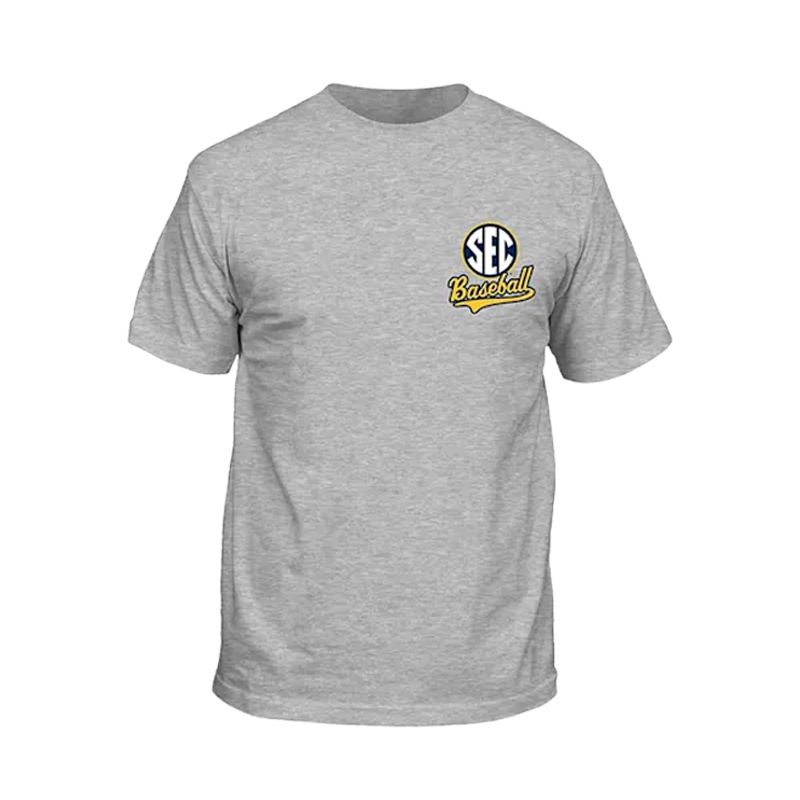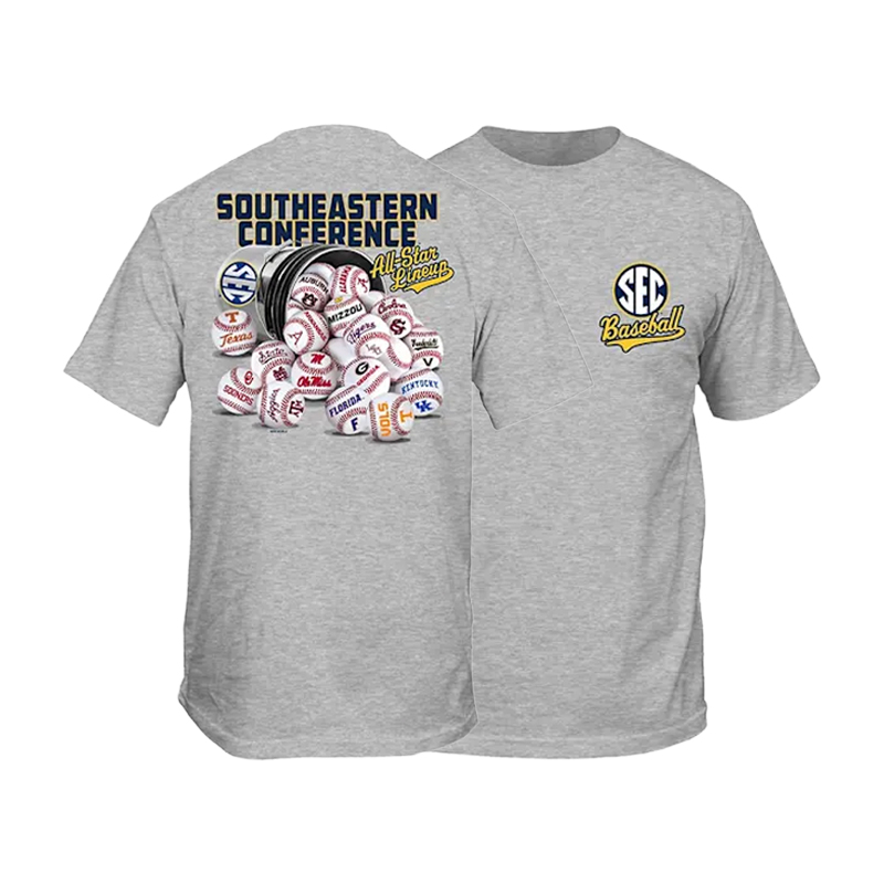 Product Description: A heather gray short sleeve T-shirt with a small SEC Baseball logo on the left chest and a large graphic on the back showing a bucket filled with illustrated baseballs representing SEC teams and the words “Southeastern Conference All-Star Lineup.”