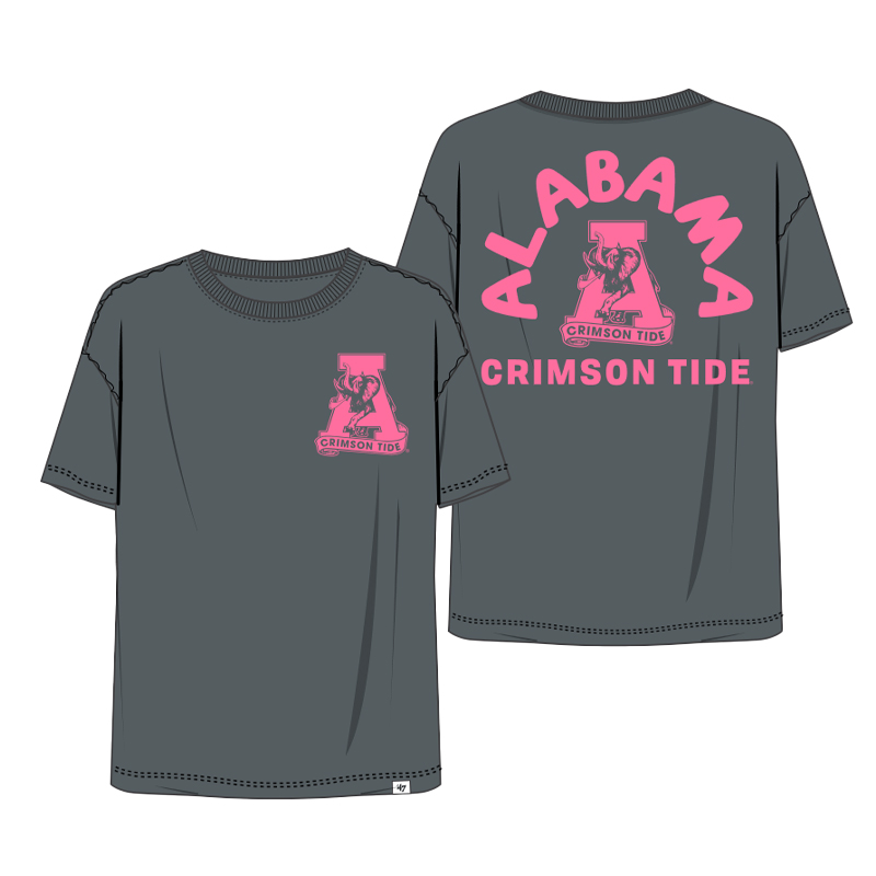 Bring bold energy and a playful twist to your Crimson Tide wardrobe with the Alabama High Spirits Sadie T-Shirt. This charcoal tee features a bright pink vintage-style Script A graphic with Big Al front and center on both the chest and back. On the back, “ALABAMA CRIMSON TIDE” arches proudly over the eye-catching design, making this oversized tee a standout piece whether you’re on campus or out with friends.