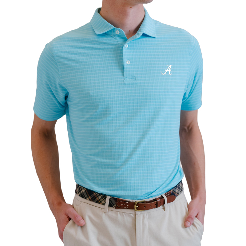 Product Description: A light blue striped performance polo featuring the white Alabama Script A logo on the chest, made from moisture-wicking fabric.
