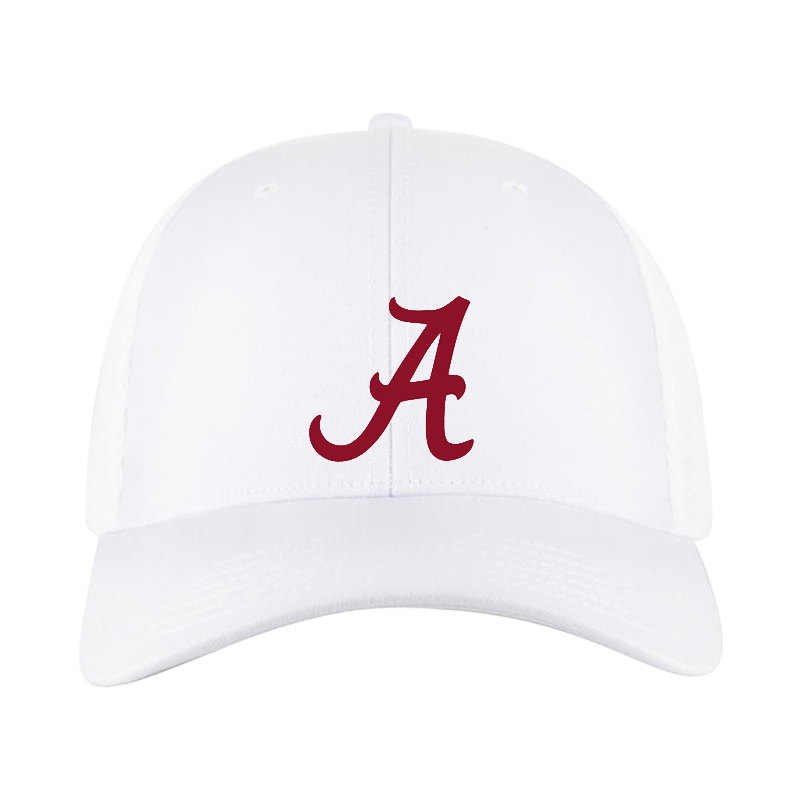 Product Description: A white cap with a structured front, breathable mesh back, and a crimson Alabama Script A logo on the front.