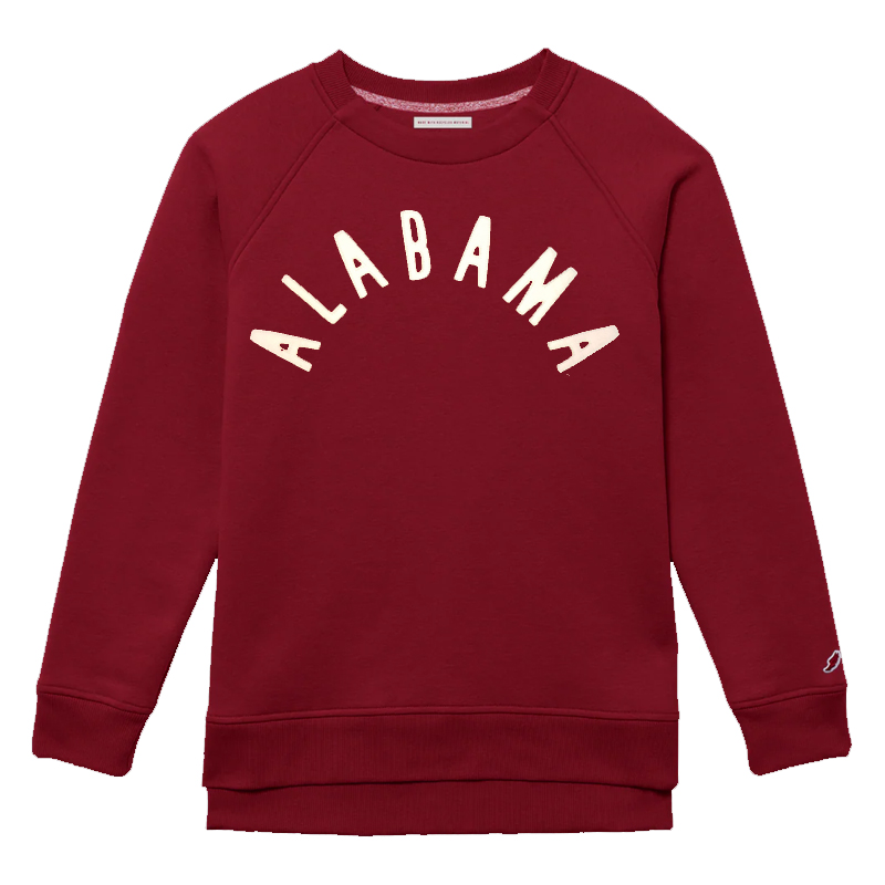 Product Description: A crimson crewneck sweatshirt with long sleeves and ribbed cuffs and hem, featuring arched “ALABAMA” lettering appliqued across the front..