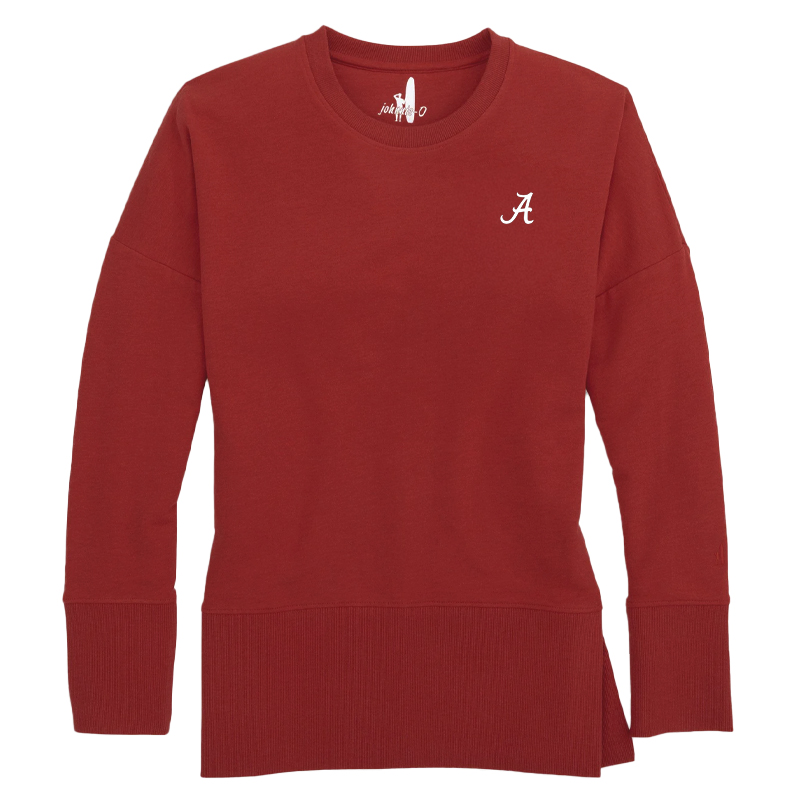 Cozy up in Crimson Tide style with the Brittany Crew Neck Sweatshirt featuring the Alabama Script A. This rich crimson sweatshirt blends effortless comfort with everyday elegance, thanks to its relaxed silhouette, soft fabric, and stylish side-slit hem. The embroidered Script A on the chest adds a refined touch of Alabama pride, perfect for game days, campus strolls, or lounging in total comfort.