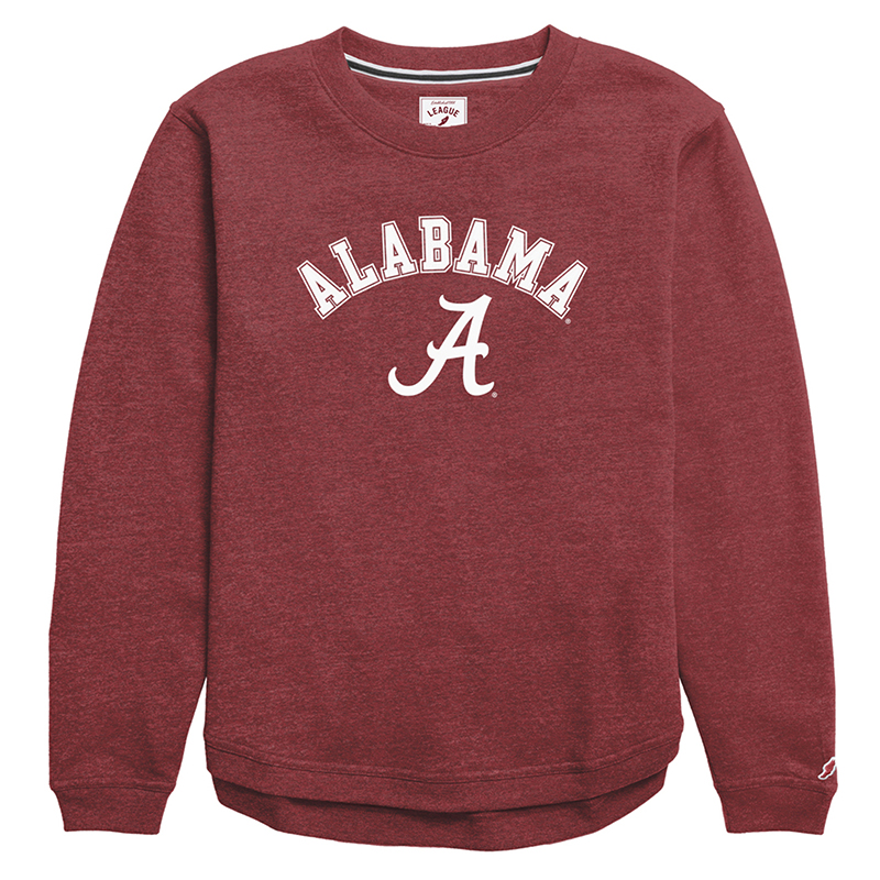 Product Description: A soft crimson crewneck sweatshirt featuring arched “Alabama” text and the Script A logo printed on the front.