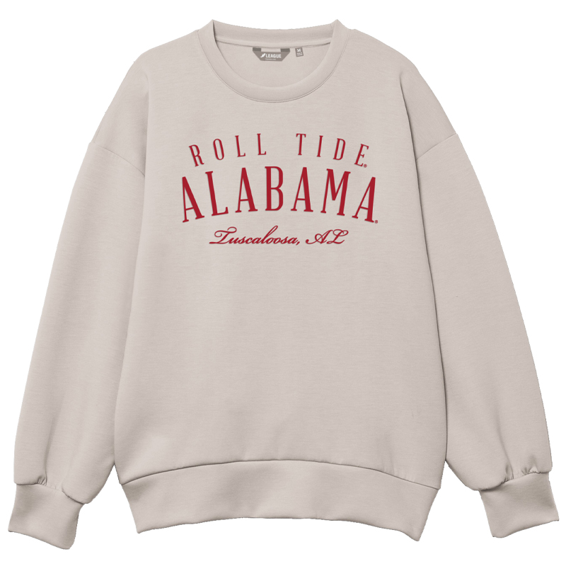 Product Description: A light beige crewneck sweatshirt with “Roll Tide,” “Alabama,” and “Tuscaloosa, AL” printed in red on the front.