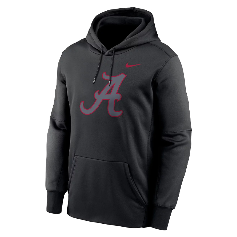 Product Description: A black Nike fleece hoodie featuring a crimson-outlined Script A logo on the front, with a front pouch pocket and adjustable drawstring hood.