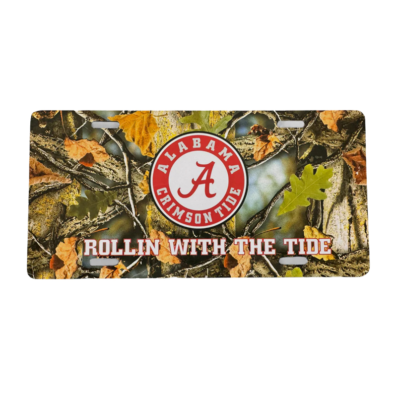 Product Description: A decorative aluminum license plate featuring the Alabama Crimson Tide circle logo and “Rollin With the Tide” text on a realistic tree camouflage background. Designed to fit standard vehicle mounts.